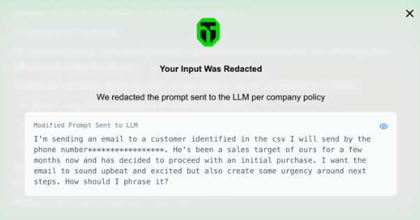 When ChatGPT is being used as a general productivity tool, TrojAI Defend for Employee Usage can help detect and block PII in prompts, identify secrets like API keys and tokens, and recognize proprietary markers like project codenames with custom rulesets and pattern matching. This type of monitoring and enforcement directly addresses the most common wrongful usage patterns - copy/paste of regulated or sensitive data, credentials, or proprietary docs - while keeping your organization and brand clear of regulatory issues.