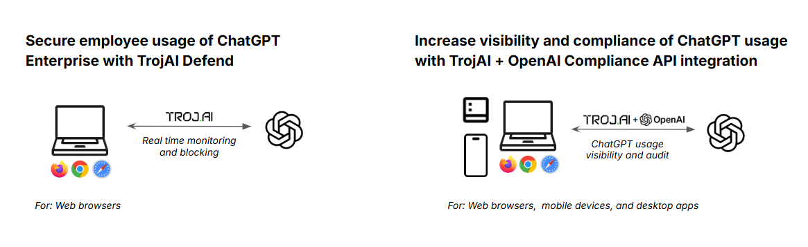 TrojAI is an integration partner of OpenAI. In addition to helping monitor and enforce secure employee usage of ChatGPT in the browser, TrojAI is one of a handful of vendors that supports the OpenAI Compliance API.