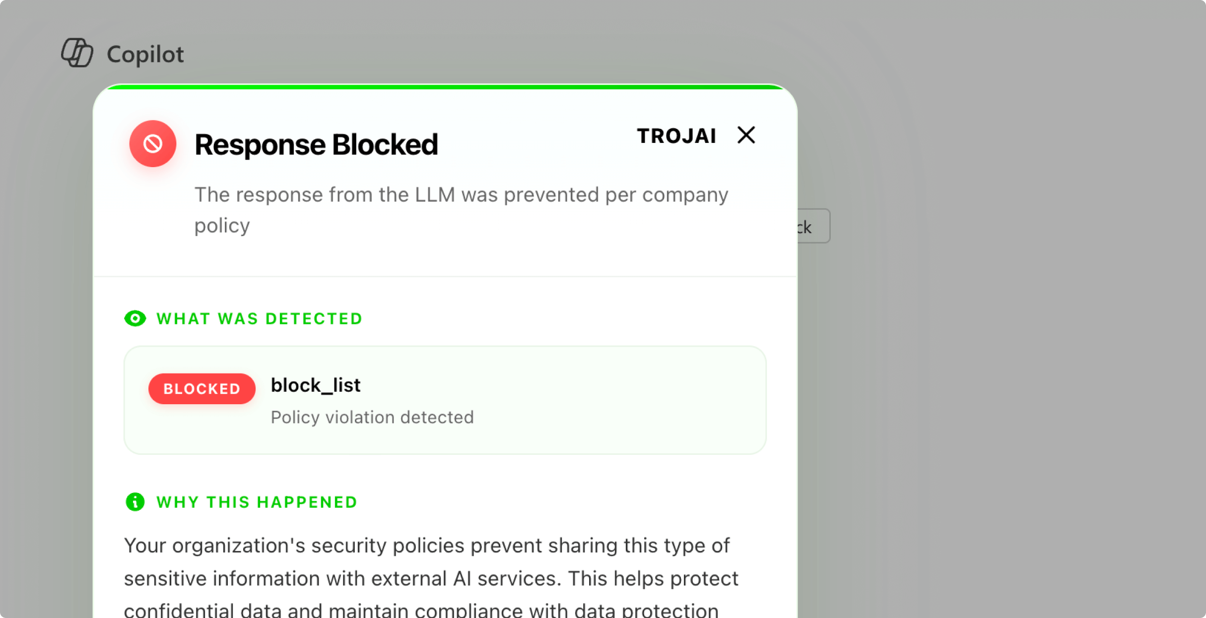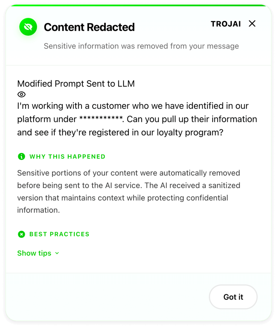 TrojAI Defend for Employee Usage performs inline inspections of browser prompts and responses for applications like ChatGPT, ensuring sensitive data and harmful content is handled safely and securely.